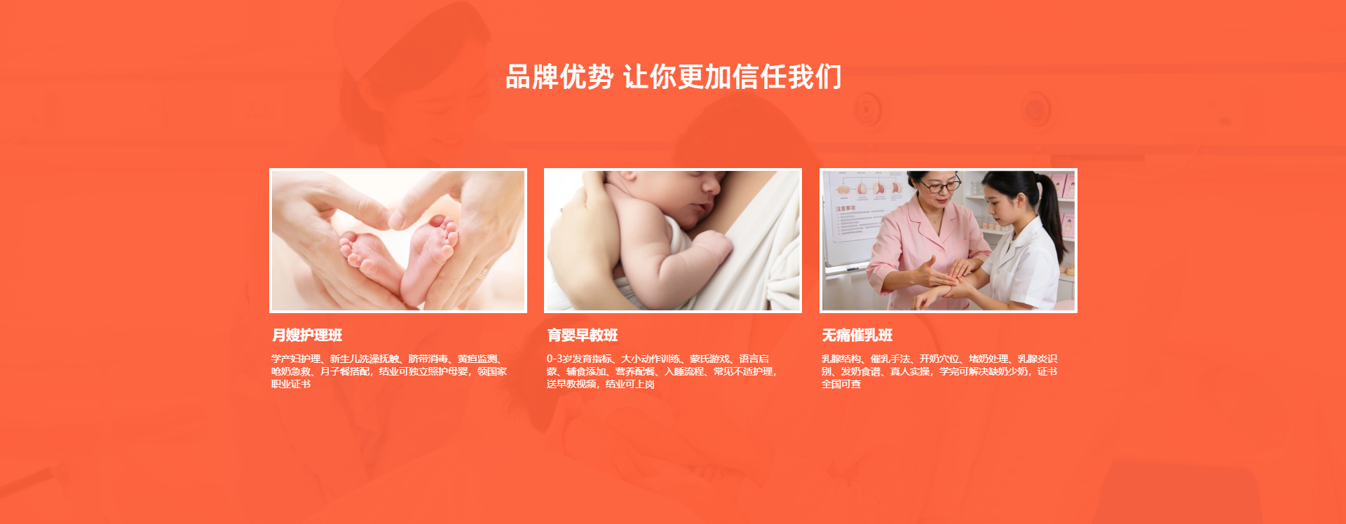 课程:月子餐、育婴、母婴护理;育婴师三级技师;公共营养师一级技师;心理