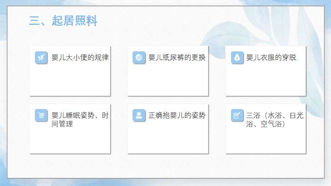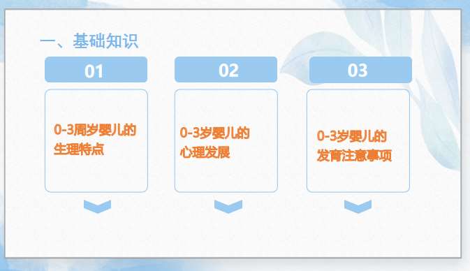 婴幼儿保健和护理知识,发热,呕吐,腹泻,鹅口疮,黄疸,脐部护理训练,宝宝大动作,精细动作,认知,培养情绪,情感与社会性行为。